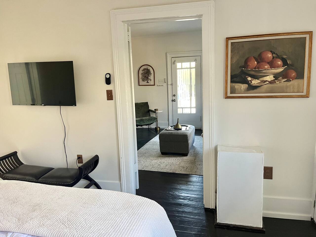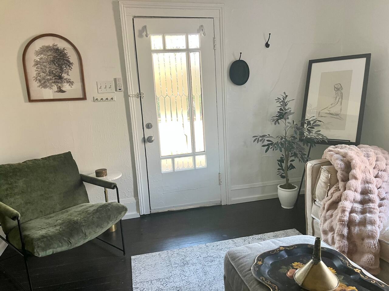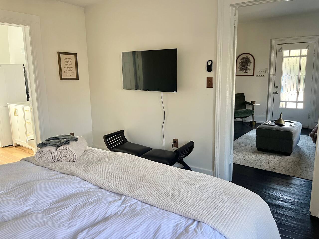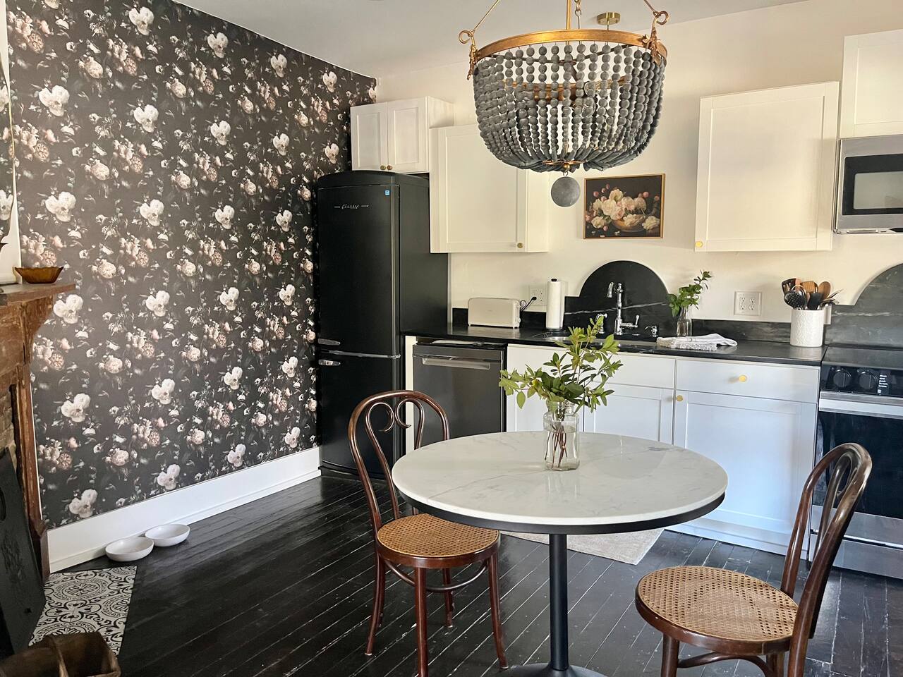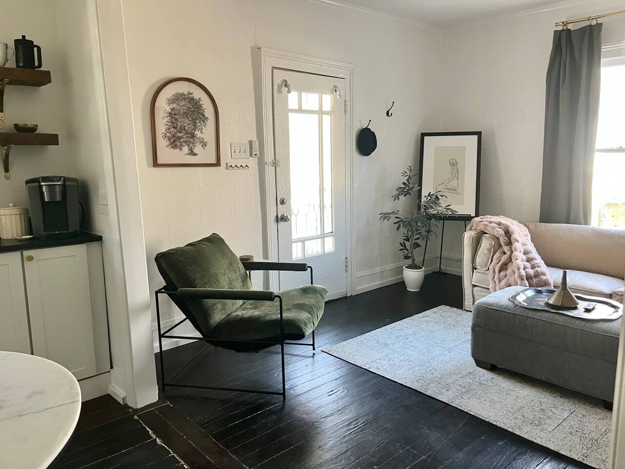 Enjoy this first floor one bedroom, charming apartment in the heart of Historic Oakwood. This apartment has great workability and is centrally located to all that Oakwood and downtown Raleigh have to offer.! Across the street from the Oakwood cemetery, you will find the Porch Parlor! Situated next to a community garden this charming street and home will be adored by everyone. The historic preservation of this building has been wonderful! Stepping onto the porch, you will want to just sit and relax. Enjoy your morning coffee or a cocktail in the evening. As you enter the home you will love the 10 foot ceilings , incredible light, woodwork and more, along with a large open living space. The darling kitchen has been fully renovated with all brand, new appliances and cabinets and countertops. Enjoy the coffee bar and the cute dining area along with the ornamental fireplace in the kitchen. In the living room, you will have another fireplace adding charm , and a large smart TV, Wi-Fi with a comfy seating area for enjoying time together and room for guests! Off of the living room is the large Private master suite, a King bed with original clawfoot tub, washer and dryer, walk in closet , smart TV and ceiling fan. There’s Google fiber so you will be able to work comfortably in the space or just enjoy the space for a quick trip to Raleigh! There is also a shared backyard with the other units that is fully fenced so you can bring your fur baby or take a stroll through the neighborhood as it’s extremely walkable and very pet friendly! We are just 3 minutes away from Person Street, downtown Raleigh Moore Square! Close to red hat, theater, and Moore! 5 minutes to Mordecai, and 10 minutes to the village District, ,440 NC State and Hillsborough Ave! 15 minutes to the Lenovo Center area/ and the State fairgrounds, and Only 18-20 minutes from the airport so making this location highly desirable! As we are close to everything!